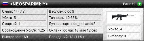 | 28.11.2015 @ 07:45 - 07:46 | de_westwood | 00:01:21 | 0 | 1 | 0 | 0.00% | 16.67% | 96.00 |