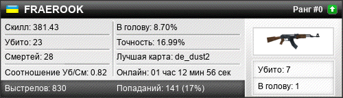 | de_dust2 | 11 | 1.83 | 0.57 | 1 | 10 | 00:19:12 | 14.06.2017 | |