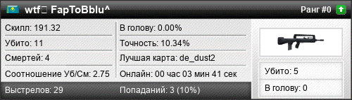 | de_dust2 | 10 | 5.00 | 21.43 | 2 | 5 | 00:00:28 | 15.06.2017 | |