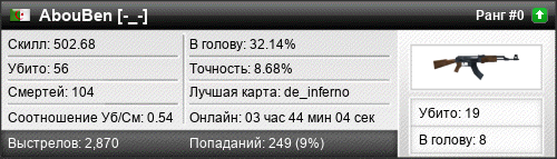 | de_mirage | 4 | 0.50 | 0.23 | 1 | 10 | 00:17:14 | 23.06.2017 | |