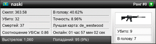 | de_inferno | 9 | 0.82 | 0.43 | 1 | 13 | 00:21:08 | 25.06.2017 | |