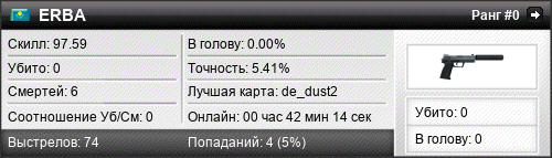| 01.07.2017 @ 05:24 - 05:33 | de_aztec | 00:09:24 | 0 | 5 | 0 | 0.00% | 5.41% | 96.21 |
