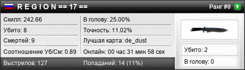 | de_dust | 4 | 0.57 | 0.27 | 1 | 11 | 00:15:03 | 03.07.2017 | |