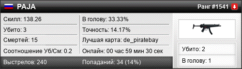 | 04.01.2016 @ 20:16 - 20:32 | de_piratebay | 00:16:24 | 2 | 11 | 1 | 50.00% | 14.77% | 140.40 |