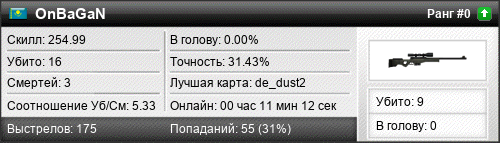 | de_dust2 | 16 | 5.33 | 1.44 | 1 | 8 | 00:11:05 | 20.07.2019 | |