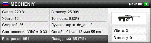 | de_dust2 | 9 | 0.69 | 0.30 | 3 | 16 | 00:29:46 | 20.08.2017 | |