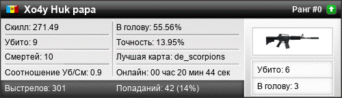 | de_scorpions | 9 | 0.90 | 0.46 | 2 | 14 | 00:19:46 | 27.07.2017 | |