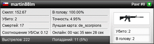 | de_scorpions | 2 | 0.29 | 0.19 | 1 | 8 | 00:10:23 | 27.07.2017 | |