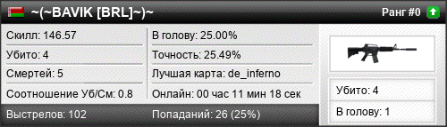 | 27.09.2017 @ 08:28 - 08:36 | de_inferno | 00:08:26 | 4 | 3 | 1 | 25.00% | 27.94% | 146.91 |