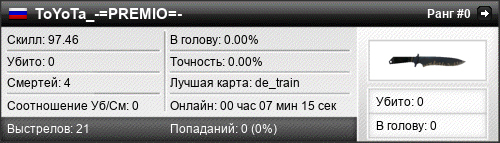 | de_inferno | 0 | 0.00 | 0.00 | 1 | 4 | 00:04:42 | 08.08.2017 | |
