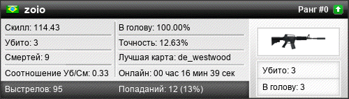 | 12.08.2017 @ 07:14 - 07:18 | de_westwood | 00:04:34 | 2 | 3 | 2 | 100.00% | 15.63% | 116.49 |