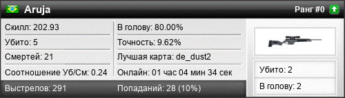 | 14.08.2017 @ 21:37 - 21:52 | de_iridium | 00:15:37 | 0 | 0 | 0 | 0.00% | 0.00% | 198.33 |