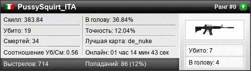 | 19.09.2017 @ 03:30 - 03:33 | de_cbble | 00:03:10 | 1 | 2 | 0 | 0.00% | 22.22% | 292.27 |