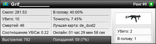| de_dust2 | 6 | 0.46 | 0.23 | 1 | 18 | 00:26:14 | 23.08.2017 | |