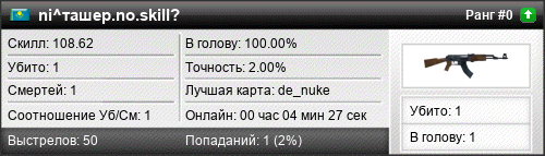| de_nuke | 1 | 1.00 | 0.25 | 1 | 2 | 00:03:56 | 25.08.2017 | |