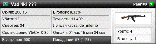 | 10.10.2017 @ 06:09 - 06:23 | de_aztec | 00:14:14 | 1 | 11 | 0 | 0.00% | 11.61% | 204.16 |