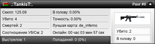 | de_inferno | 4 | 2.00 | 1.03 | 1 | 4 | 00:03:53 | 01.11.2015 | |