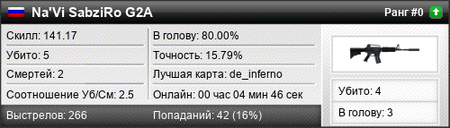 | de_inferno | 5 | 2.50 | 1.05 | 0 | 4 | 00:04:46 | 01.01.1970 | |