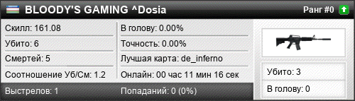 | de_inferno | 6 | 1.20 | 0.53 | 1 | 7 | 00:11:16 | 27.09.2017 | |