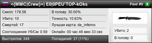 | de_inferno | 4 | 4.00 | 0.60 | 1 | 5 | 00:06:41 | 29.09.2017 | |