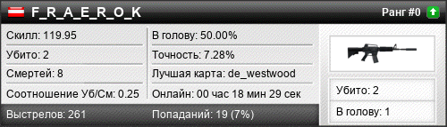 | 11.06.2016 @ 19:33 - 19:36 | de_spay | 00:02:07 | 0 | 0 | 0 | 0.00% | 4.55% | 119.95 |
