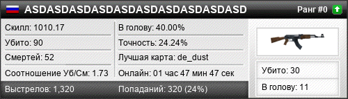 | de_dust2 | 15 | 1.67 | 0.46 | 5 | 25 | 00:32:42 | 27.11.2023 | |