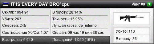 | de_inferno | 71 | 1.45 | 0.57 | 10 | 86 | 02:04:35 | 26.12.2017 | |