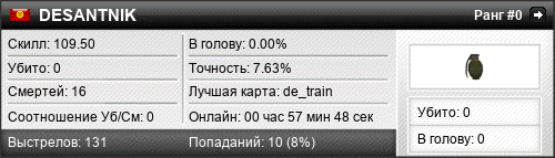 | 17.10.2019 @ 21:07 - 21:24 | de_cpl_stone | 00:16:35 | 0 | 0 | 0 | 0.00% | 0.00% | 100.62 |