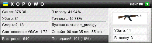 26.11.2017 @ 10:18 - 10:43 de_prodigy 00:24:45 27 12 13 48.15% 16.63% 344.00 Разница: +99.38