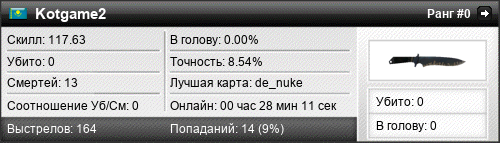 | de_nuke | 0 | 0.00 | 0.00 | 1 | 12 | 00:21:29 | 27.11.2017 | |