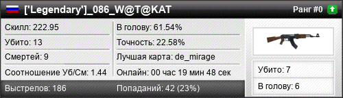 | de_mirage | 11 | 1.38 | 0.86 | 1 | 8 | 00:12:50 | 04.12.2017 | |