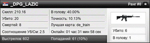 | 01.11.2015 @ 05:19 - 05:24 | de_inferno | 00:04:19 | 2 | 2 | 1 | 50.00% | 8.76% | 210.16 |