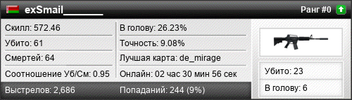 | de_mirage | 23 | 1.92 | 0.70 | 1 | 21 | 00:32:40 | 04.01.2018 | |