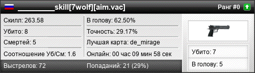de_mirage | 6 | 3.00 | 1.14 | 1 | 3 | 00:05:15 | 08.01.2018 |