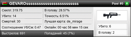 | de_mirage | 7 | 0.58 | 0.31 | 1 | 17 | 00:22:47 | 28.01.2018 | |
