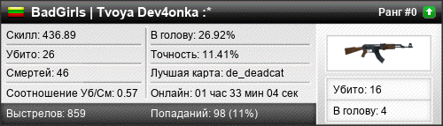 | de_mirage | 4 | 0.67 | 0.38 | 2 | 9 | 00:10:32 | 05.02.2018 | |