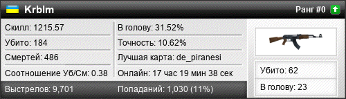 | 04.03.2018 @ 22:00 - 22:14 | de_inferno | 00:13:38 | 0 | 5 | 0 | 0.00% | 3.77% | 1172.53 |