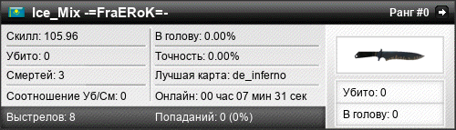 | de_inferno | 0 | 0.00 | 0.00 | 1 | 2 | 00:02:18 | 24.02.2018 | |