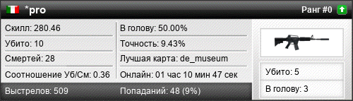 | de_museum | 5 | 1.25 | 0.59 | 1 | 6 | 00:08:28 | 03.04.2018 | |
