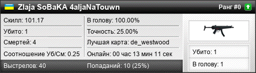 | de_westwood | 1 | 0.33 | 0.10 | 1 | 6 | 00:10:21 | 08.12.2015 | |