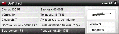 | de_inferno | 10 | 1.43 | 0.59 | 2 | 9 | 00:16:52 | 23.10.2015 | |