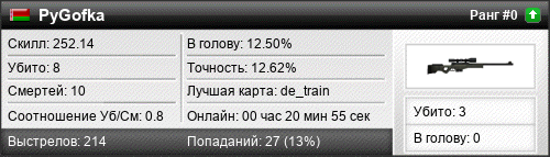 | 23.03.2018 @ 07:46 - 07:54 | de_train | 00:08:24 | 2 | 5 | 0 | 0.00% | 14.89% | 154.87 |