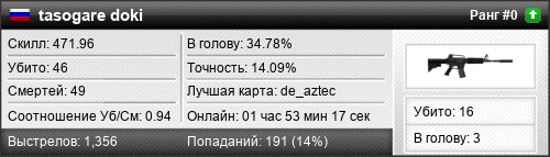 | de_aztec | 23 | 1.64 | 0.78 | 3 | 18 | 00:29:28 | 23.02.2019 | |