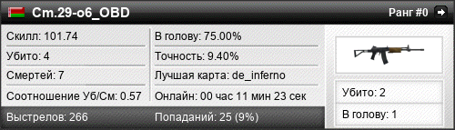 | de_inferno | 4 | 0.57 | 0.35 | 1 | 7 | 00:11:23 | 23.10.2015 | |
