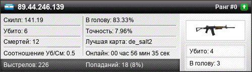 | 15.04.2016 @ 11:34 - 11:35 | de_train | 00:00:47 | 0 | 0 | 0 | 0.00% | 0.00% | 117.94 |