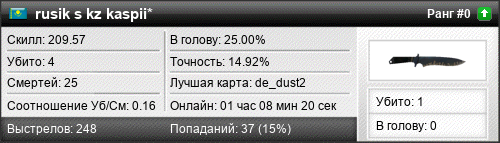 | 10.04.2018 @ 03:16 - 03:23 | de_dust2 | 00:07:50 | 1 | 4 | 0 | 0.00% | 11.32% | 182.74 |