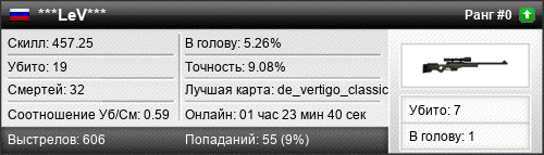 | 10.04.2018 @ 22:11 - 22:36 | de_vertigo_classic | 00:25:43 | 12 | 12 | 1 | 8.33% | 10.00% | 374.32 |
