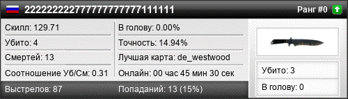 | de_inferno | 0 | 0.00 | 0.00 | 1 | 1 | 00:02:10 | 15.04.2018 | |
