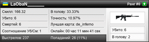 | de_inferno | 5 | 1.00 | 0.55 | 1 | 9 | 00:09:04 | 21.04.2018 | |