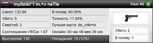 | de_inferno | 5 | 1.67 | 0.75 | 1 | 5 | 00:06:39 | 10.12.2015 | |